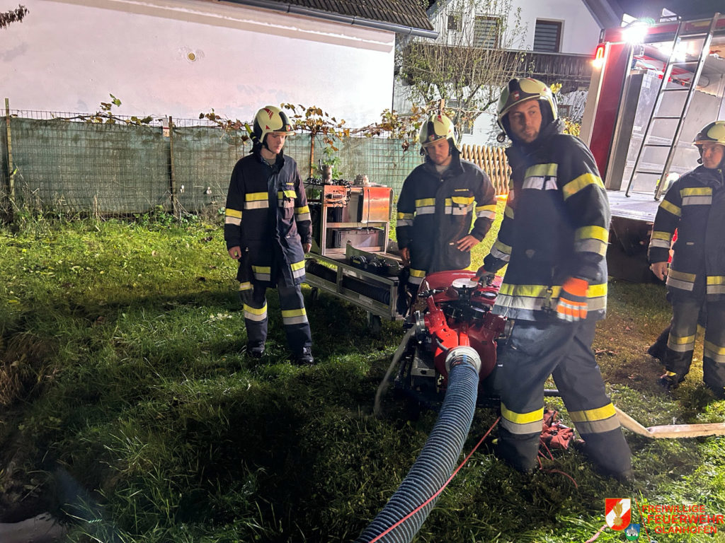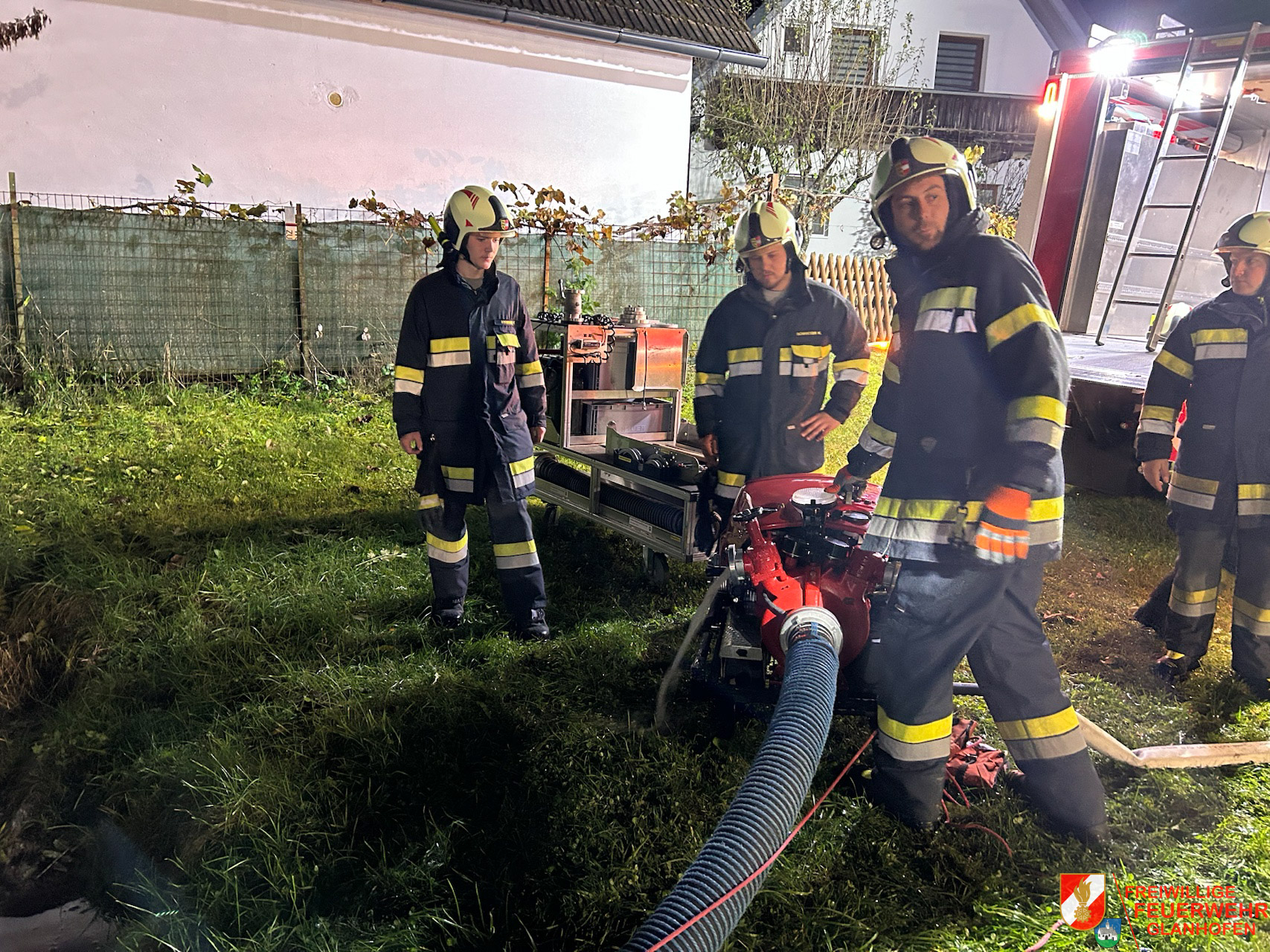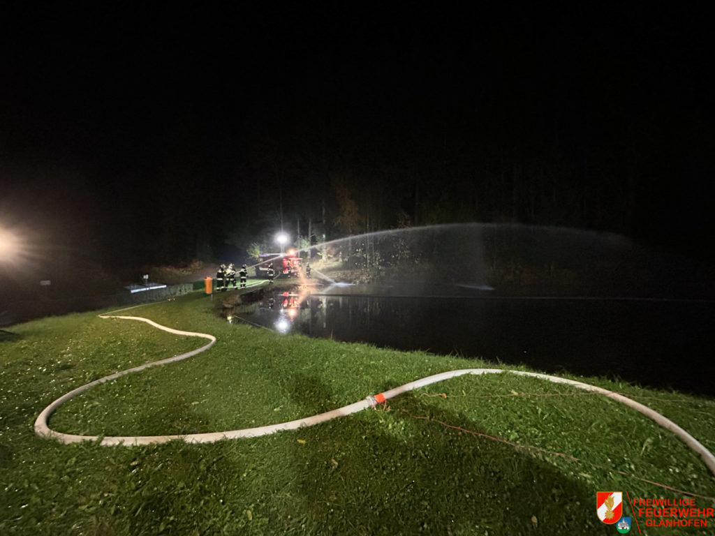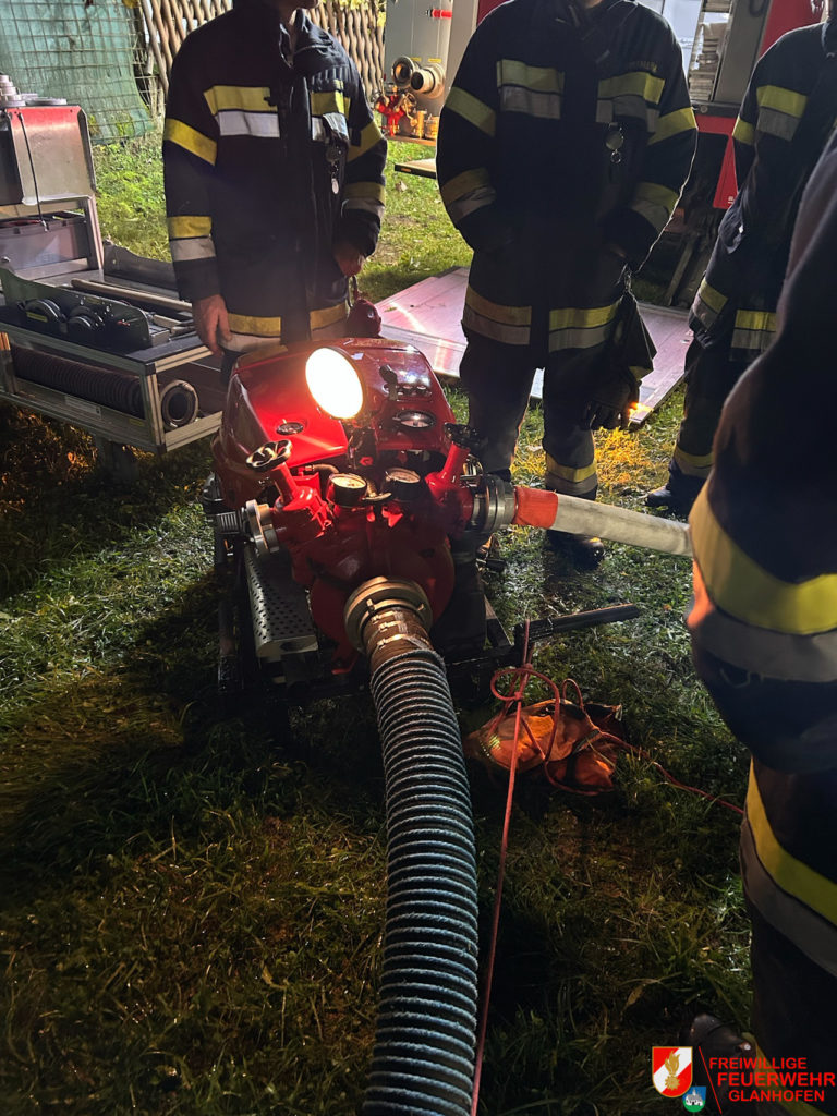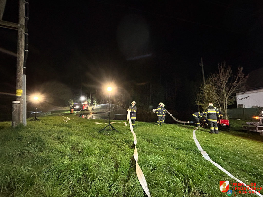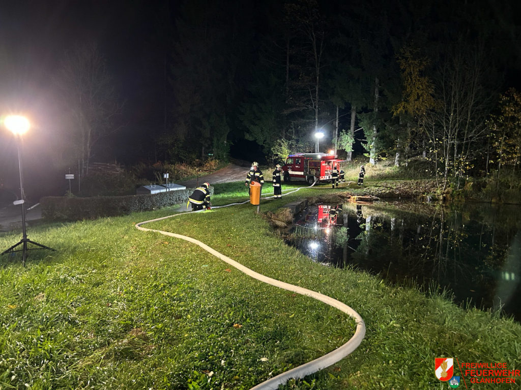 Außerdem wurde der Wasserbezug aus dem Moser Teich mittels Tragkraftspritze (TS) beübt. Im Zuge dessen gab es auch eine kurze Auffrischung zur Handhabung der TS.
