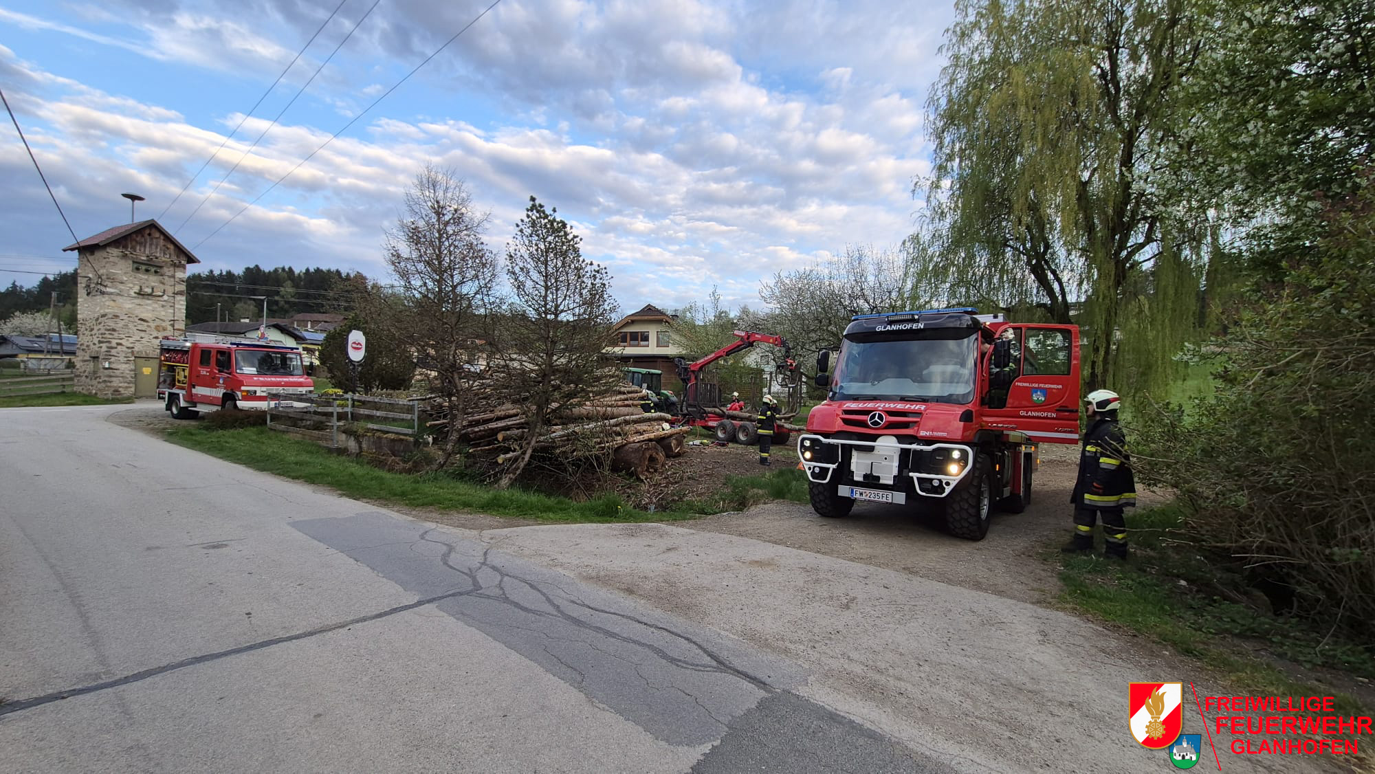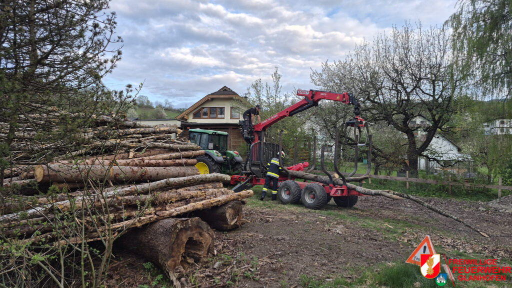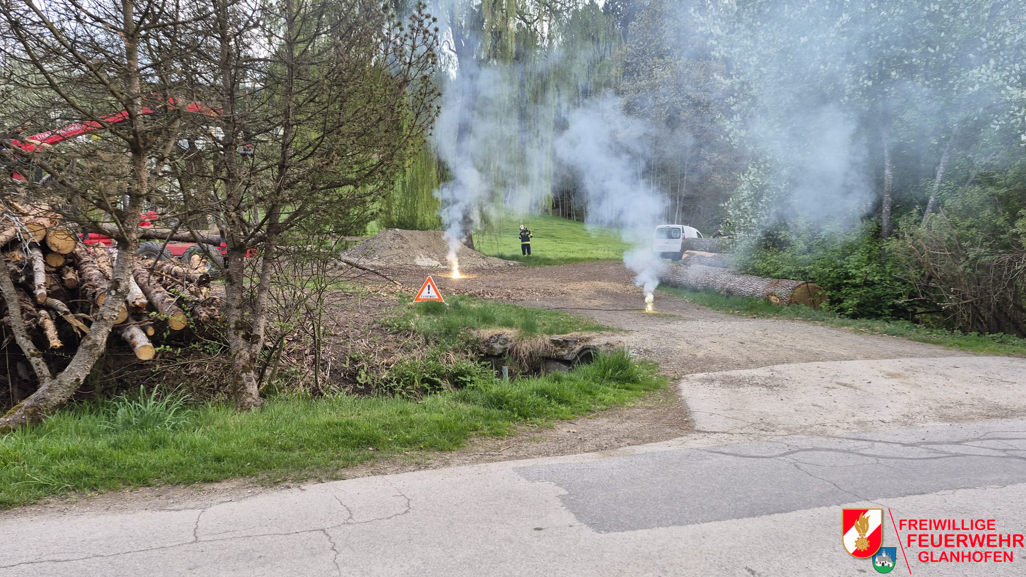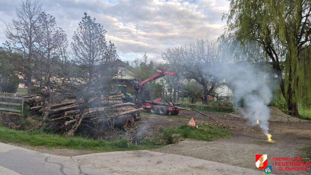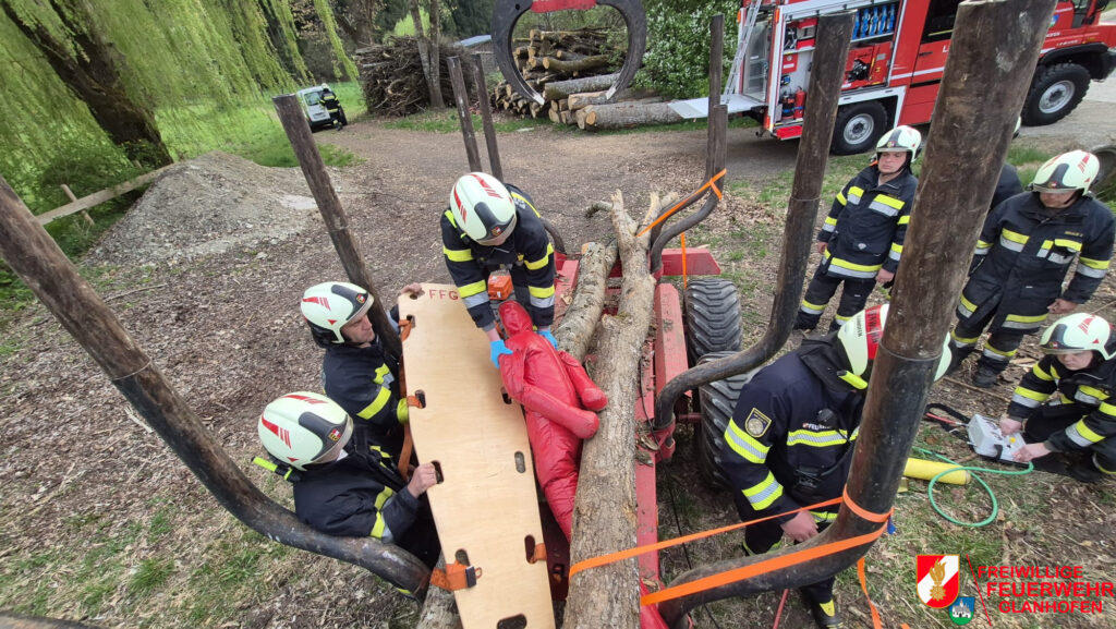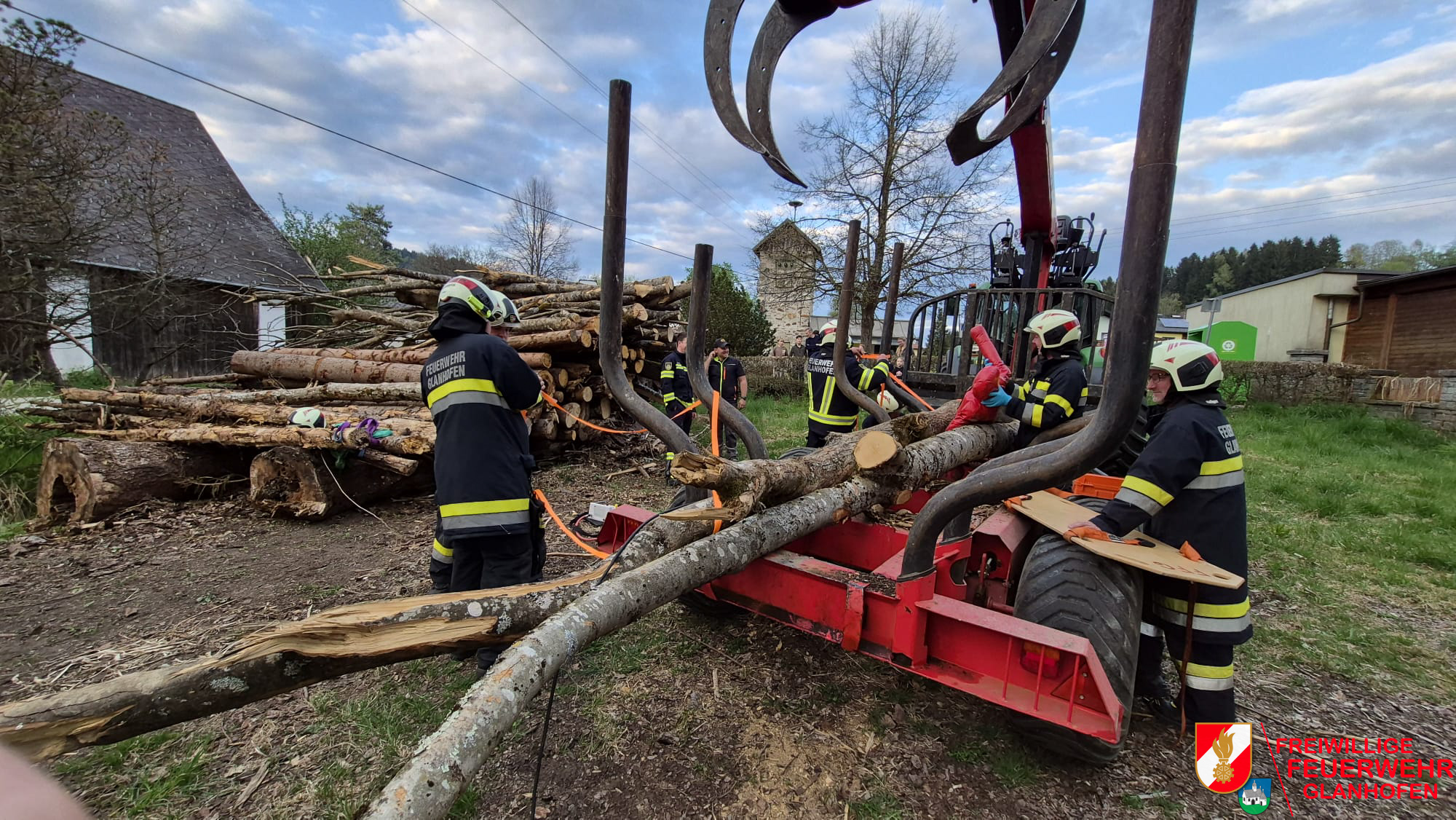 Übungsannahme war, dass ein Holzkran eine 20-kV Stromleitung beschädigt hat. Im Gefahrenbereich befanden sich zwei verletzte Personen, wobei eine Person unter einem Holzstamm eingeklemmt war.